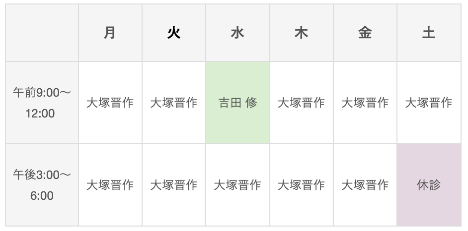 | 午前9:00〜12:00 | 大塚晋作 | 大塚晋作 | 吉田 修 | 大塚晋作 | 大塚晋作 | 大塚晋作 |